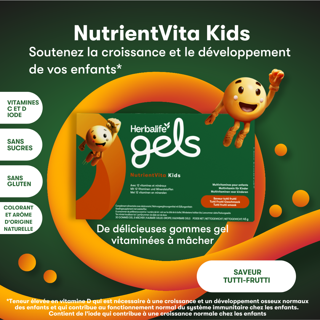 Herbalife Gels NutrientVita Kids sont des gommes gel à mâcher spécifiquement développées pour apporter des nutriments essentiels aux enfants. Leur goût tutti frutti et leur format innovant les rendent particulièrement faciles à faire prendre. Elles sont formulées avec 12 vitamines et minéraux pour contribuer à la croissance normale des enfants, à une croissance et un développement osseux normaux des enfants, ainsi qu’au fonctionnement normal du système immunitaire.
