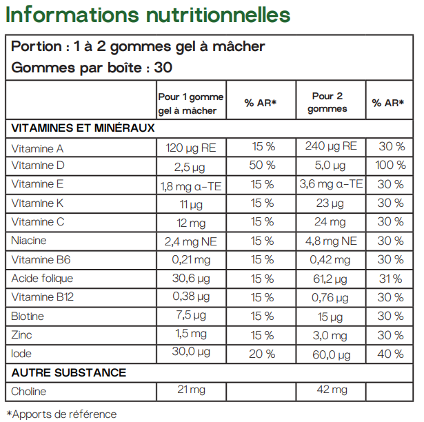 Formulé avec 12 vitamines et minéraux dont les vitamines A, B3, B6, B7, B9, B12, C, D, E et K, le zinc et l’iode