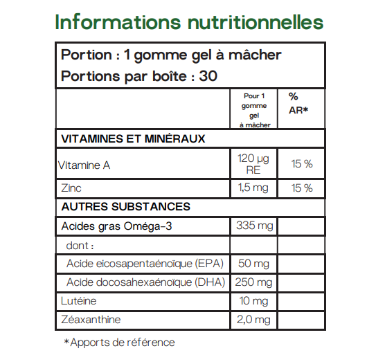 Contient du zinc, qui contribue au maintien d’une vision normale, à protèger les cellules contre le stress oxydatif et contribue au métabolisme normal de la vitamine A.